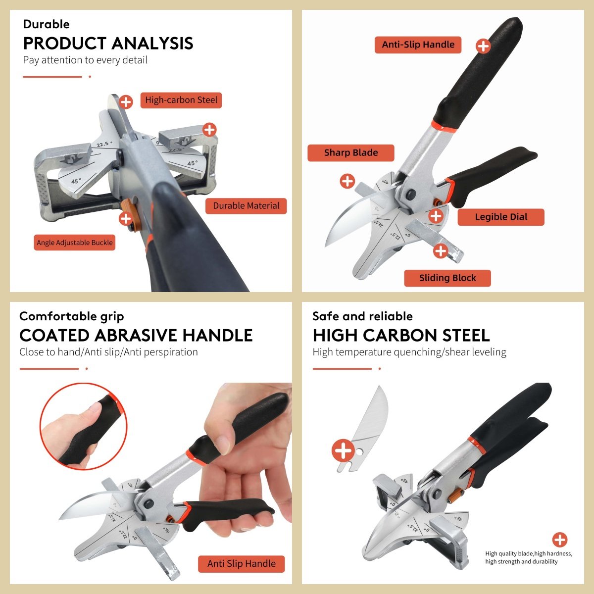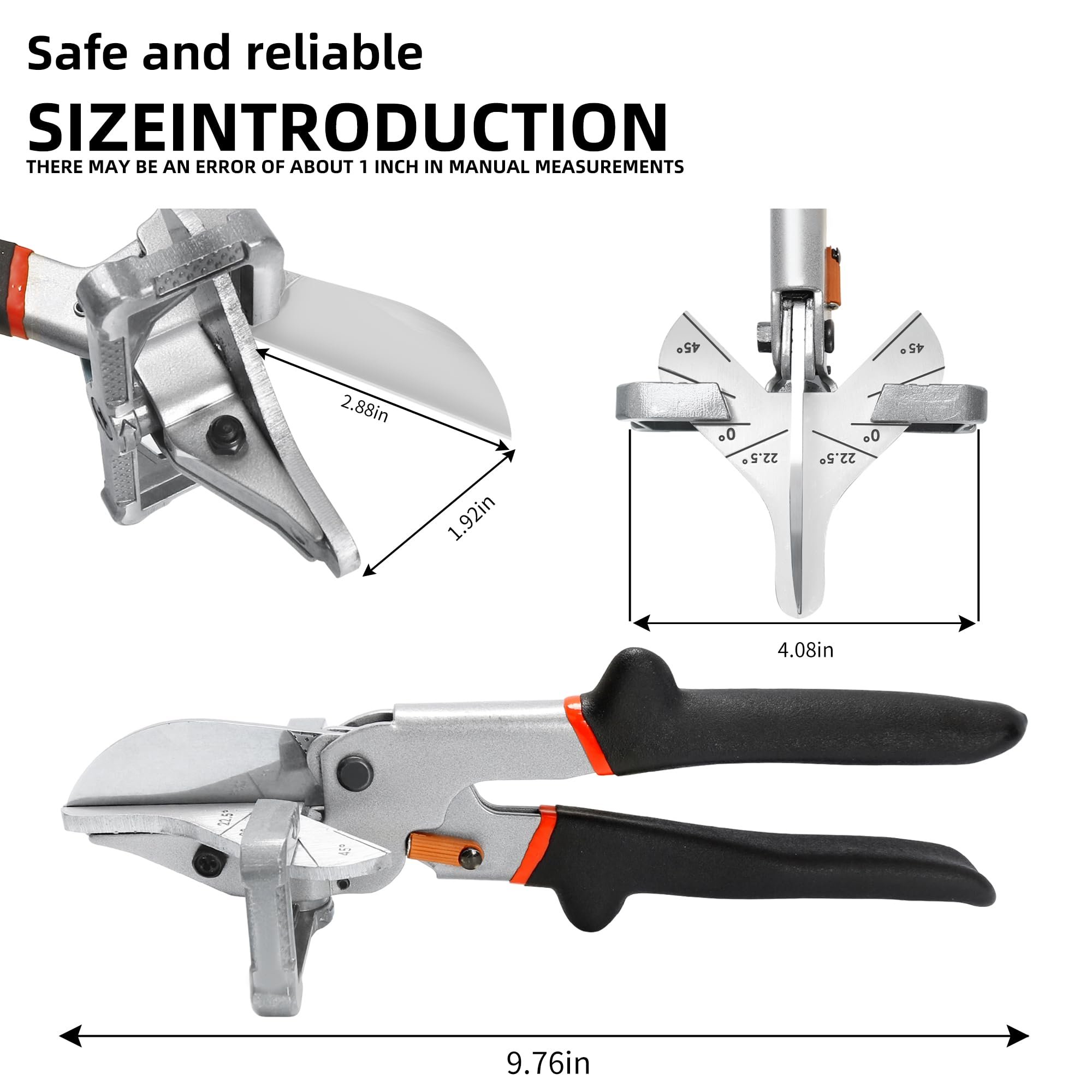 Shoe Moulding Cutters:Β These miter shears for angular cutting molding made with durable, high-quality stainless steel, these shoe mold shears will last for years and will continue to be the ideal home improvement tool. A strong and durable integrated handle is made of aluminum alloy and PPC anti-skid cover. Comfortable grip no hand fatigue for long-term use.